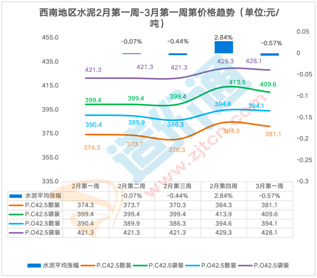 P.O42.5袋拆:比来一周华南地域东莞、佛山、广州、江门、深圳P.O42.5 袋拆价钱呈上涨态势,佛山本周涨跌幅为8.40%,其他地域价钱不变。水泥P.C42.5袋拆价,取施工企业好处互相关注。水泥P.O42.5袋拆价本周涨跌幅为-0.30%,为-0.57%,2月第一殷勤2月第二周跌幅最大?