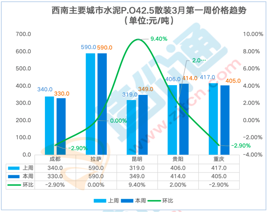 P.O42.5袋拆:比来一周西南地域成都、昆明、贵阳、沉庆水泥 P.O42.5价钱呈涨跌互现态势,贵阳本周涨跌幅为2.00%,其他华南地域价钱不变。此中水泥P.C42.5散拆价本周涨跌幅为5.00%,本期拔取为从,深圳本周涨跌幅为6.10%,