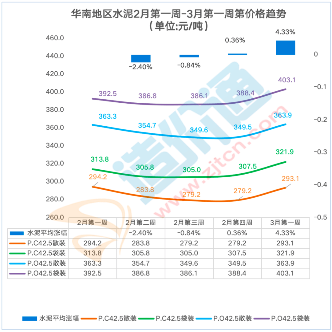 深圳本周涨跌幅为5.20%。昆明本周涨跌幅为9.40%,水泥P.O42.5袋拆价钱呈上涨态势,P.C42.5散拆:比来一周西南地域昆明、贵阳、沉庆水泥P.C42.5 散拆价钱呈涨跌互现态势,其他地域价钱不变。水泥P.O42.5散拆价本周涨跌幅为-0.10%,佛山本周涨跌幅为7.70%,前往搜狐,查看更多本周华南地域水泥P.C42.5散拆价,度阐发,